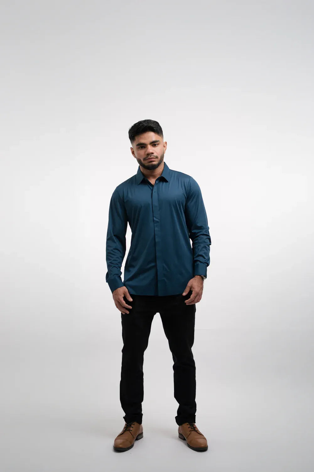 Designed with a streamlined fit that creates a sharp, flattering profile, this shirt pairs easily with dress pants, tailored pants, or dark jeans for a polished finish. The long sleeves and crisp collar bring timeless structure, while the smooth wrinkle-resistant look helps maintain a neat appearance throughout the day. Whether you're heading to the office, attending a dinner, going out for an event, or dressing up for a special occasion, this shirt brings together sophistication and convenience in one smart piece.